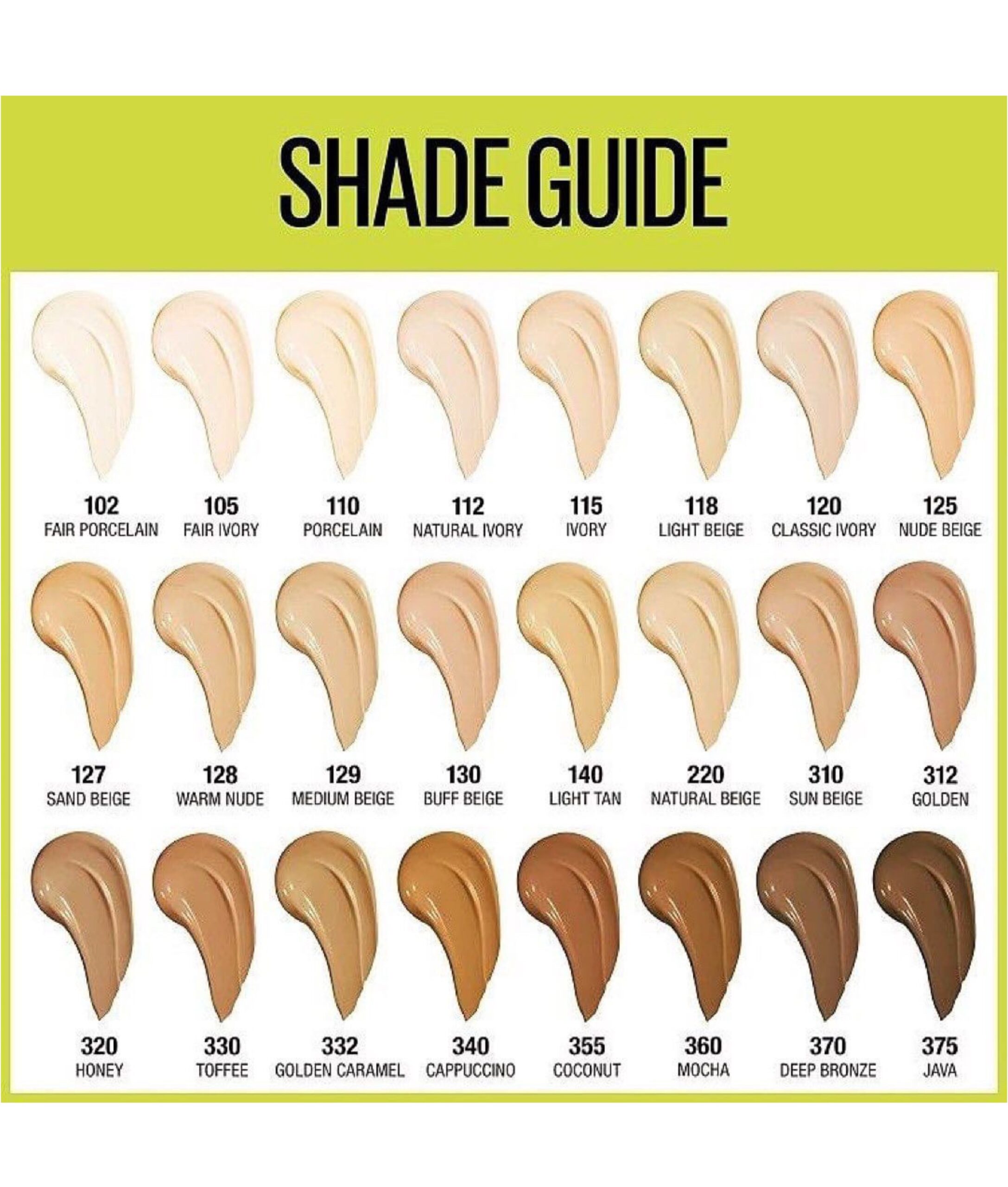 | shade | 310 – Sun Beige, 312 – Golden, 320 – Honey, 330 – Toffee, 332 – Golden Caramel, 340 – Cappuccino, 355 – Coconut, 360 – Mocha, 370 – Deep Bronze, 375 – Java, 380 – Espresso |